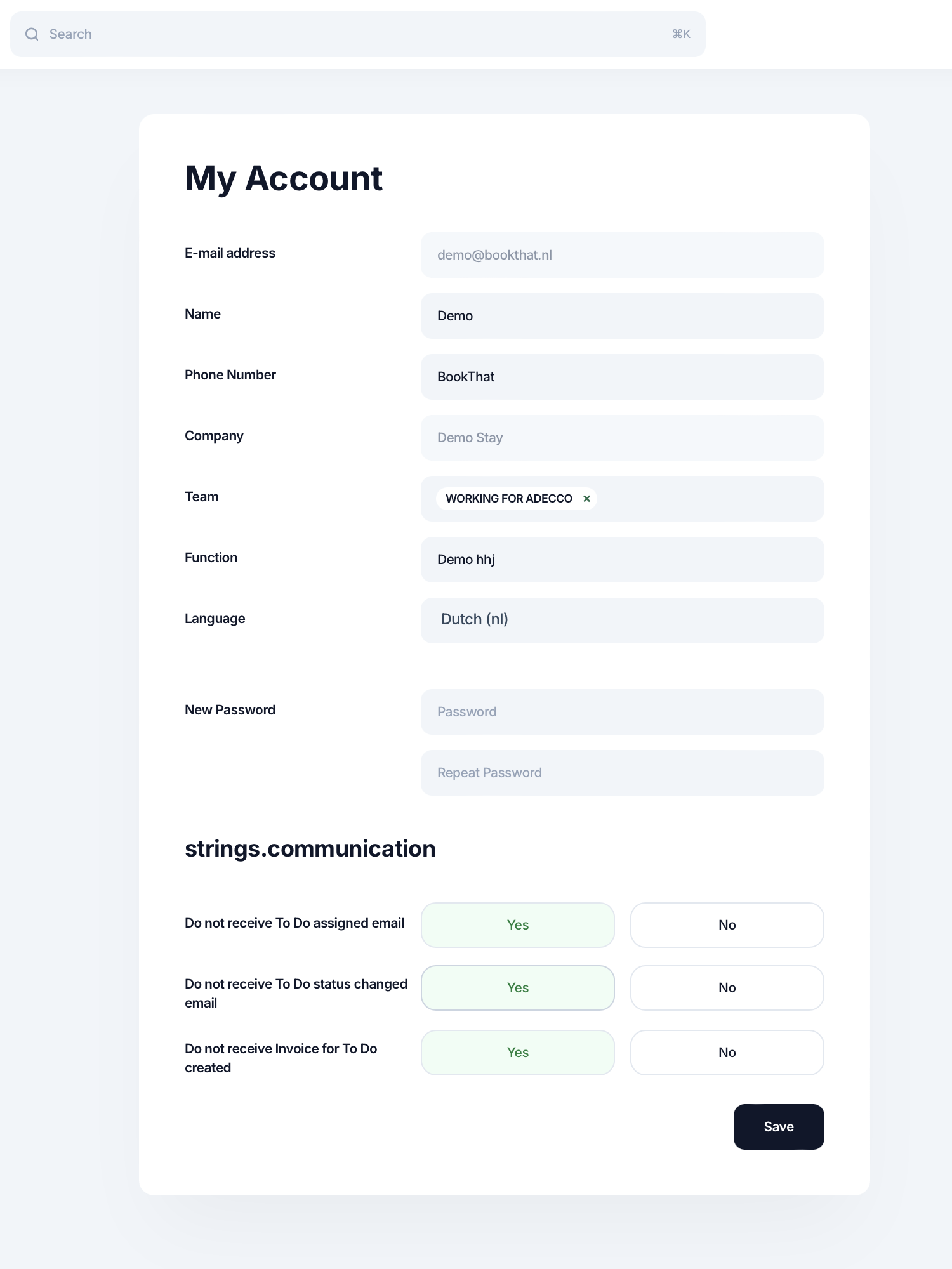 When you click on My Account, you will be taken to a page with your personal account information. The data can simply be adjusted by filling in the different boxes and then clicking Save. You can also go to the dark menu sidebar on the left and click on My account there to go to your account details.