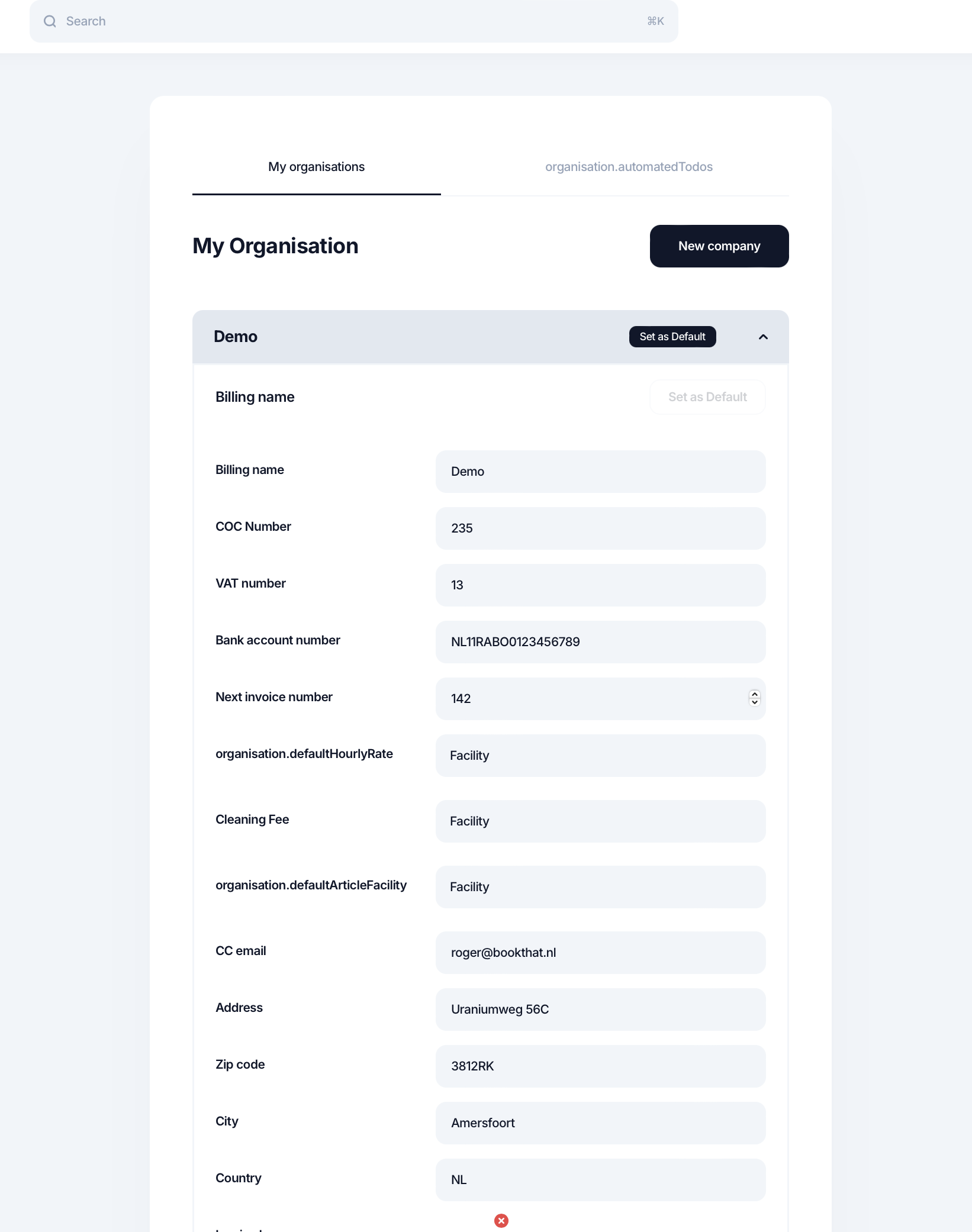 - Organization default hourly rate -> when you create an invoice from a To Do ( Read: To Do action: create invoice) you can choose to always show a line for the hourly rate so you can also add the amount of hours worked on the invoice. The default amount for the hourly rate can be set at this field. You can choose one of the facilities that you've added in the Administration tile.