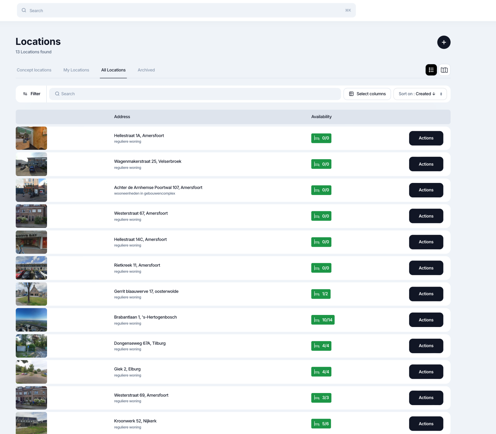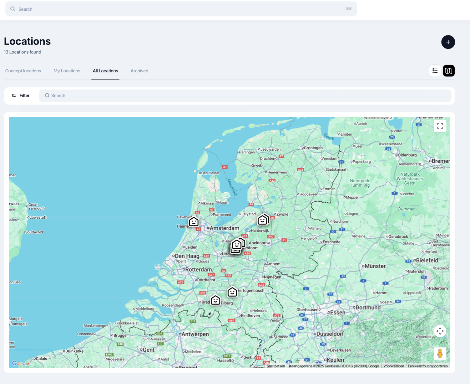 2. Gearchiveerd: Hier zie je alle locaties die momenteel niet actief zijn op het platform. Alle relevante documentatie over eerdere gebruikers en overeenkomsten worden hier ter inzage bewaard.