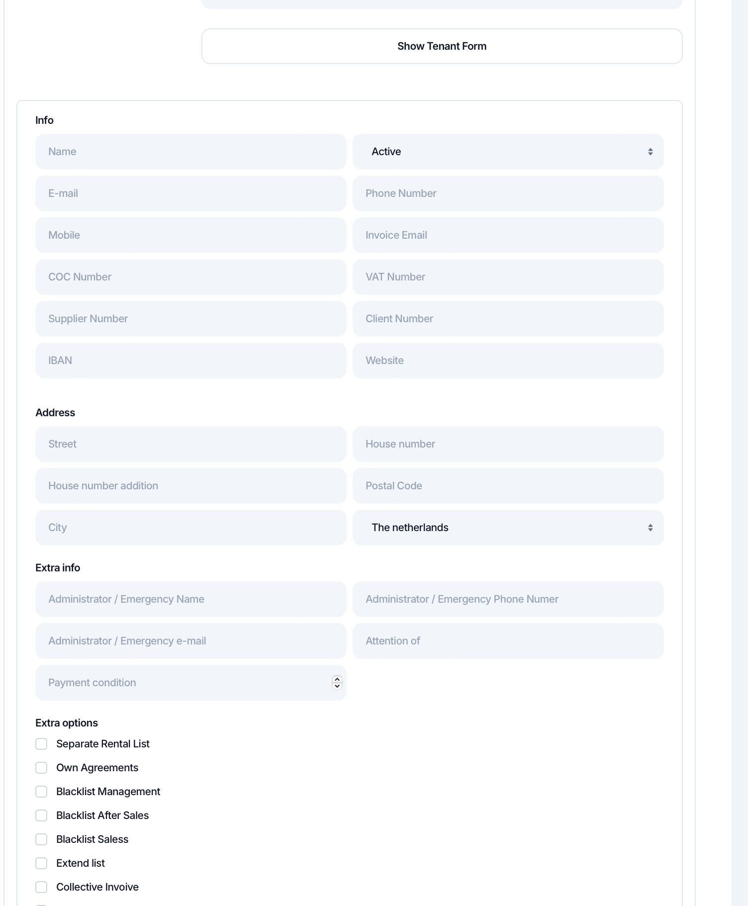 Eerst kan je kiezen voor het type contract ; is dit een huurder (je verhuurt de woning) of is het een verhuurder (je huurt de woning aan). Er zit geen limiet aan het aantal contracten die je kan toevoegen; het kan dus zijn dat je een woning aantuurt en deze verhuurt aan meerdere partijen.