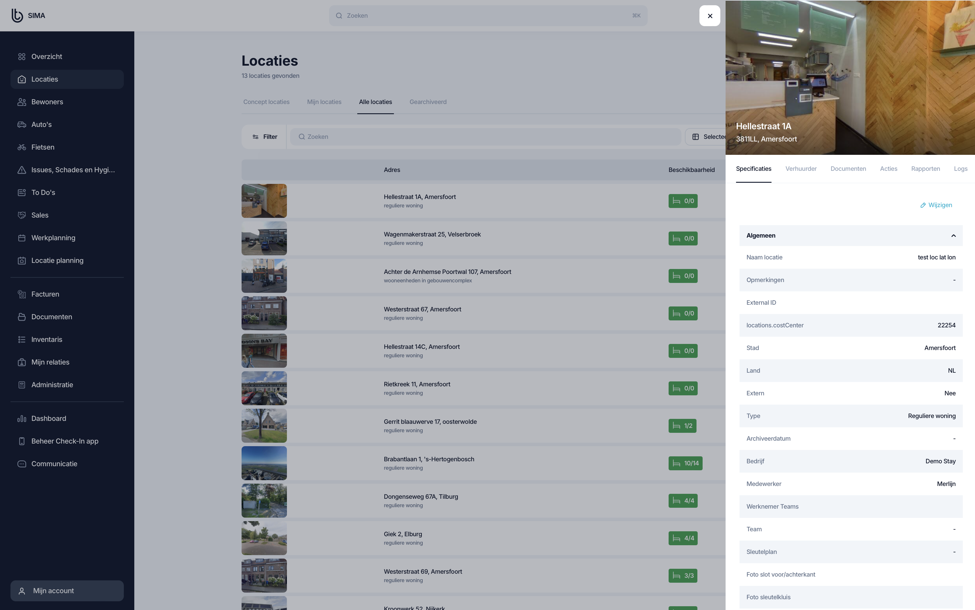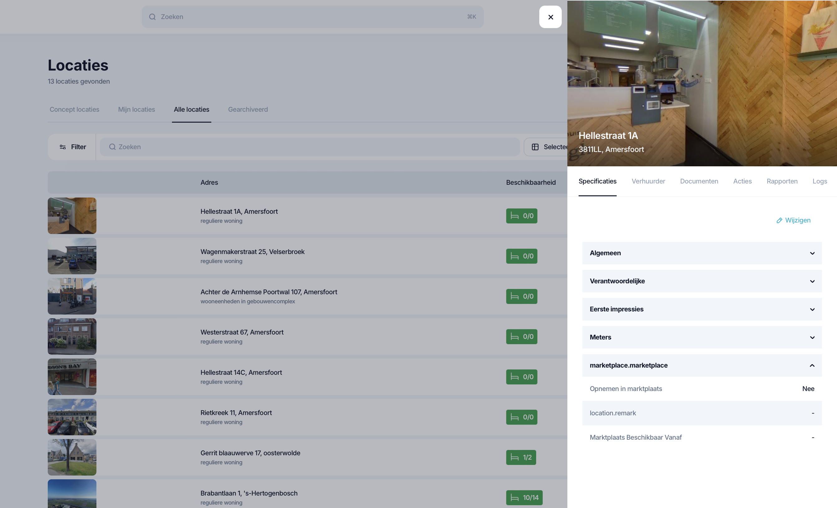 Je kunt informatie over een aangemaakte woning toevoegen, wijzigen of bekijken. Dit doe je door in het locatie overzicht te klikken op Locatie acties. Als je vervolgens op Specificaties klikt, zie je een overzicht met alle specificaties van de woning. Standaard wordt altijd het tab met algemene informatie geopend. Dit is ook de informatie die je bij het aanmaken van een locatie, hebt in ingevuld in het eerste tabblad.