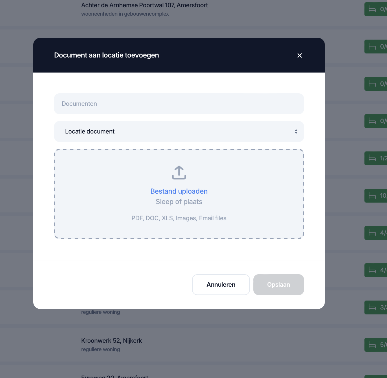 Als je naar Locatie Acties gaat en je klikt op het kopje met Documenten, dan krijg je een overzicht van de documentatie die bij de huisvestingslocatie hoort. Dit kunnen rapporten zijn, contracten en eventuele overige documenten zoals afvalwijzers en energiecontracten.