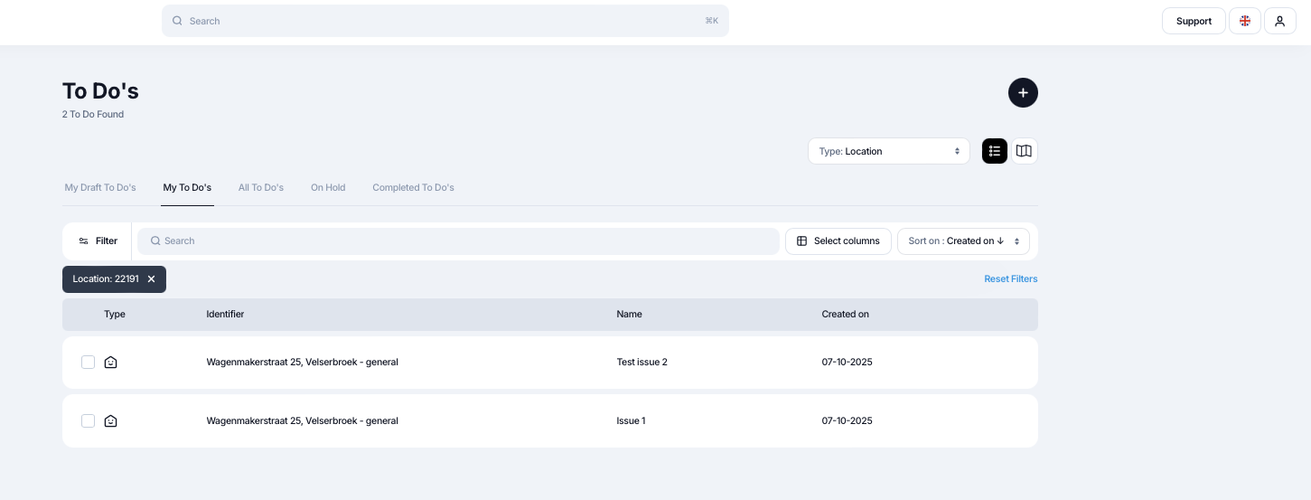 Als je op de knop met Afgeronde To do's klikt, kom je in de lijst met alle voltooide To Do's van de door jou geselecteerde huisvestingslocatie. Je kunt hier filteren op Mijn To Do's, Alle To Do's en Afgeronde To Do's. Meer informatie over To Do's en wat elk van deze categorieën inhoudt, vind je in de folder over To Do's.