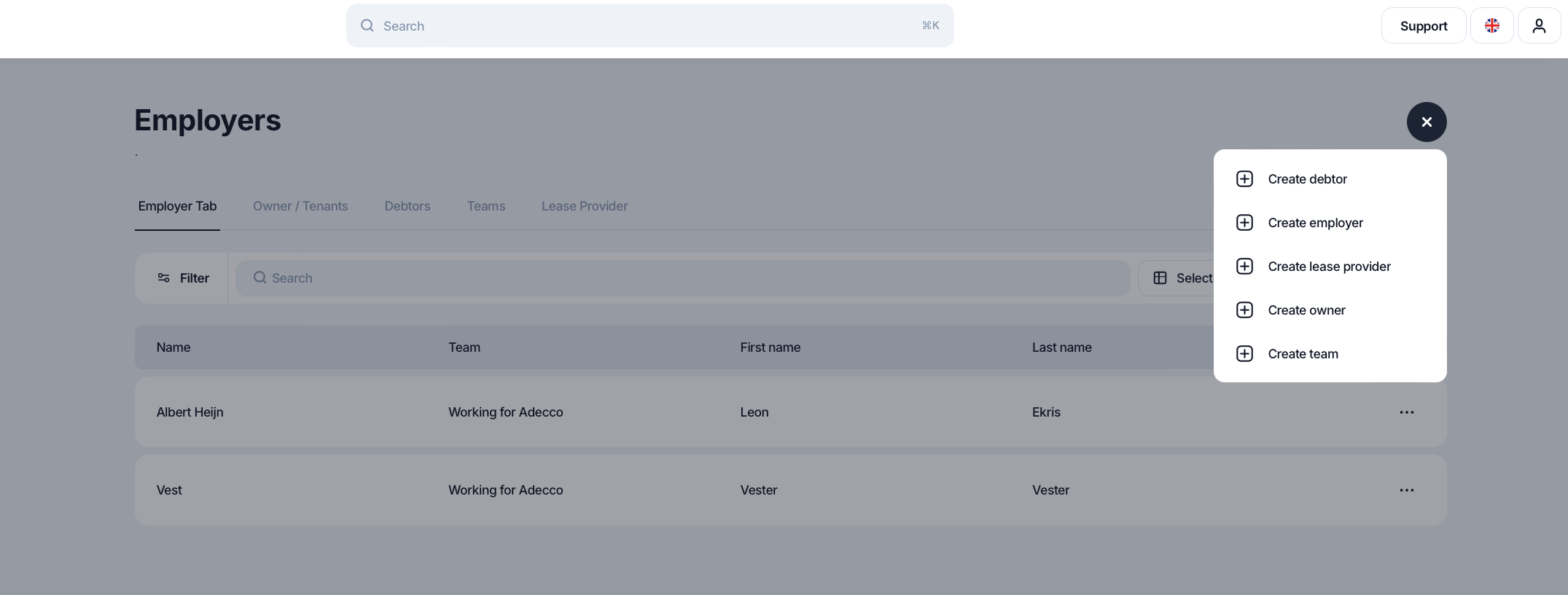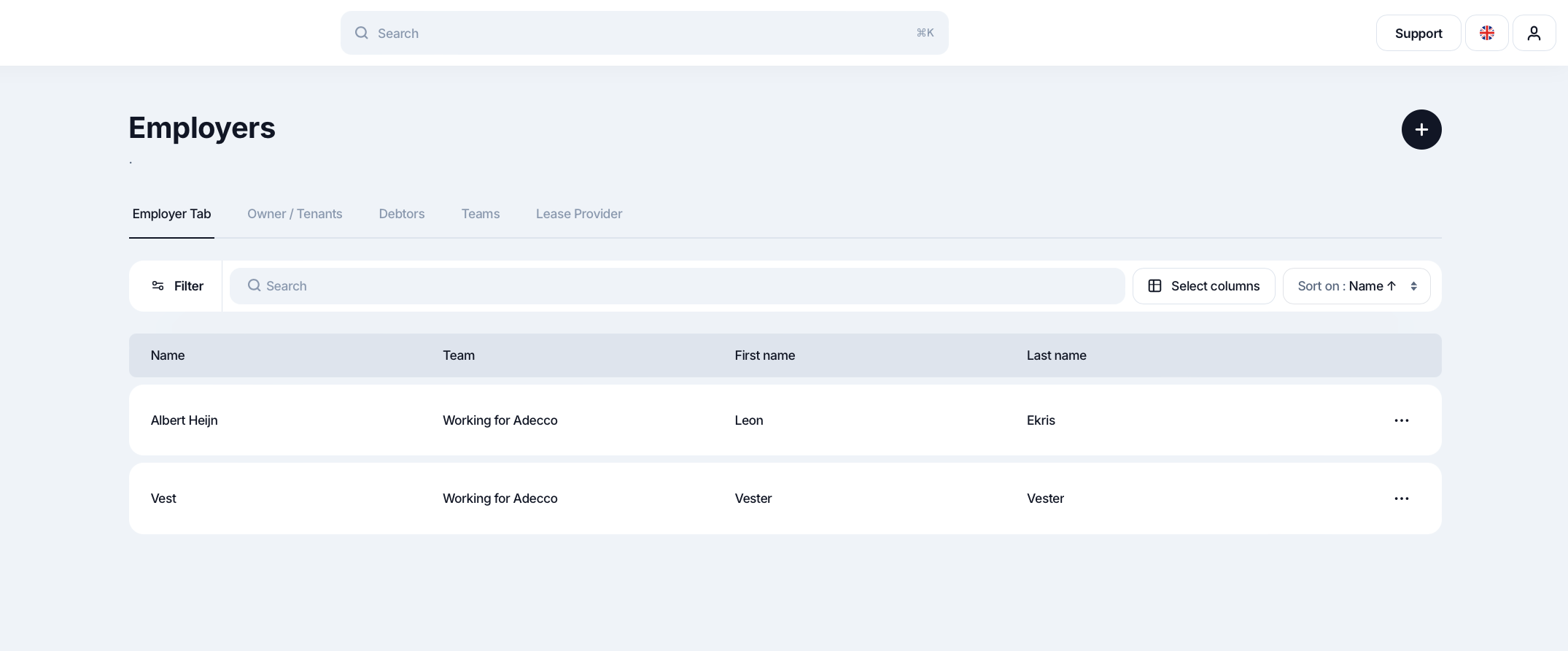 Je kunt een werkgever aanmaken door op het zwarte plusje (+) rechtsboven in het scherm te klikken. Vervolgens kies je voor de optie Werkgever aanmaken. Er wordt dan een nieuw veld geopend.
