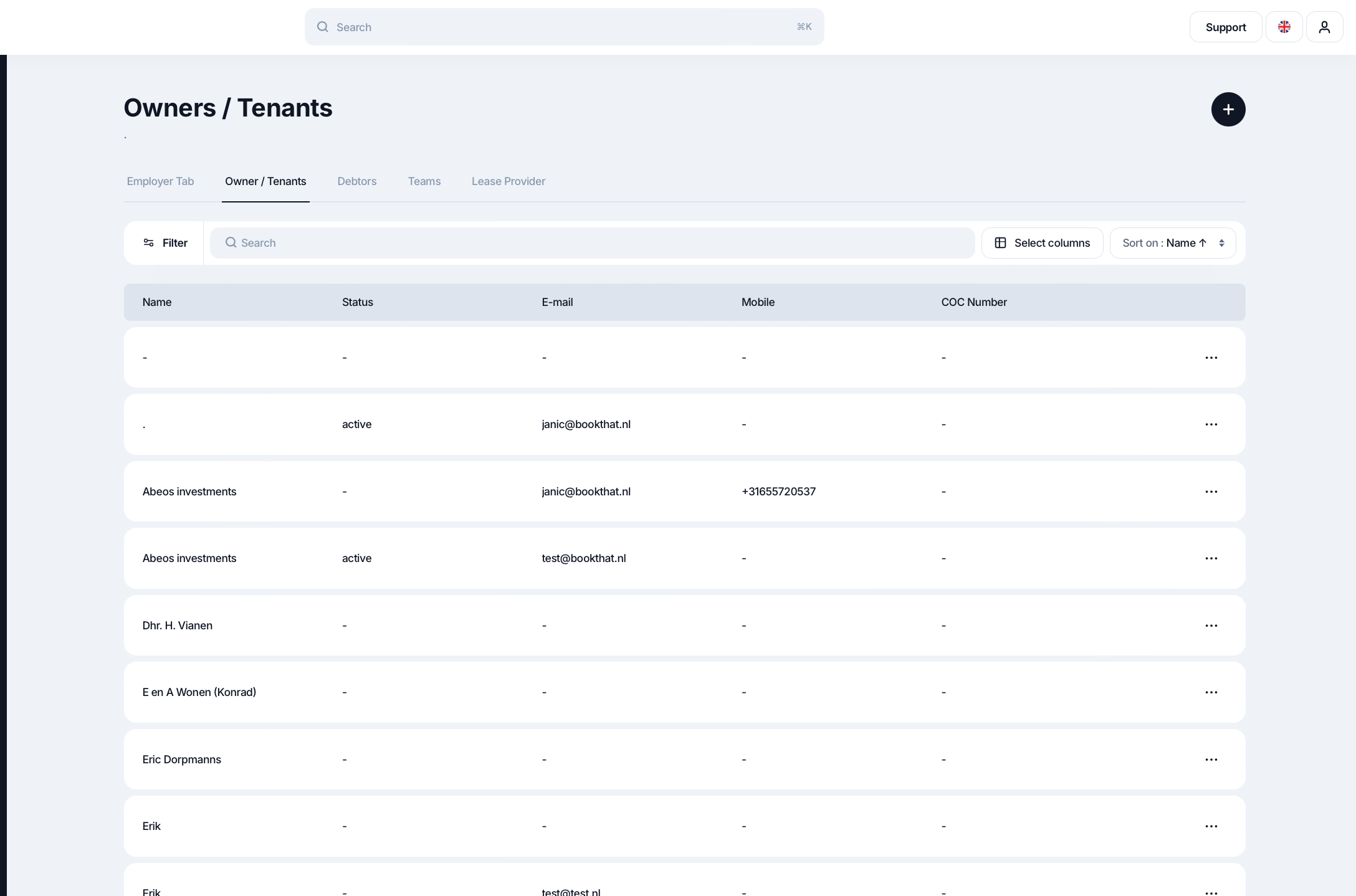 Je kunt een (ver)huurder aanmaken door te klikken op het zwarte plusje (+) rechtsboven in het scherm.