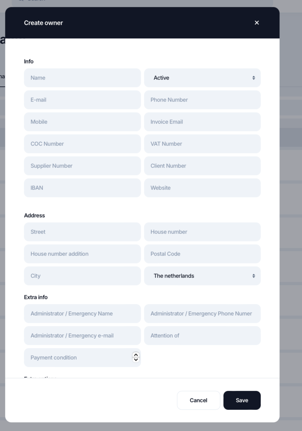 Je kunt hier de optie Creëer verhuurder selecteren. Er wordt vervolgens een nieuw veld geopend. In dit veld kan je alle informatie over de Verhuurder invullen zoals algemene info, het adres en aanvullende info. Als je klaar bent met het aanmaken van een eigenaar, kan je op de knop Opslaan klikken..