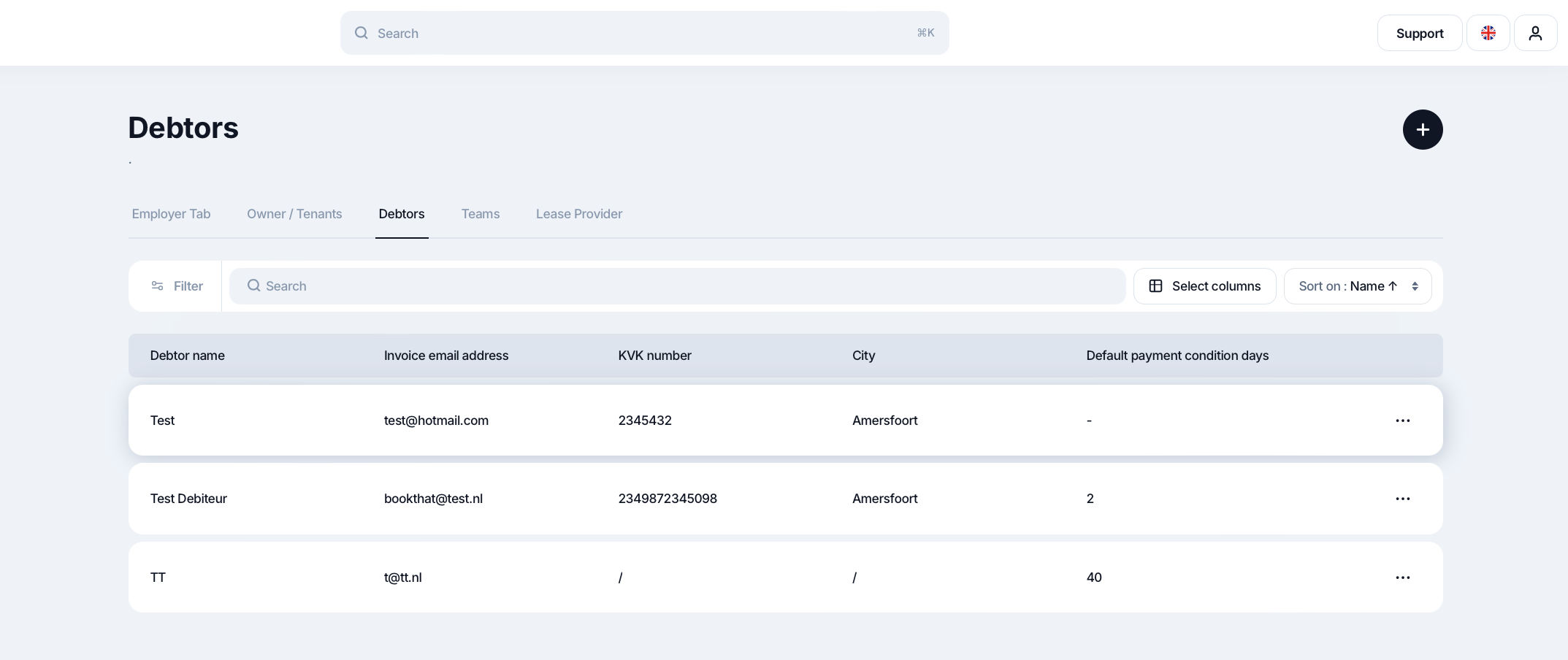 Als je een debiteur wilt bewerken of verwijderen, klik je op de drie puntjes aan de rechterkant van een debiteur en selecteer je Verwijderen of Bewerken. Als je op Bewerken klikt, wordt hetzelfde veld geopend als wanneer je een debiteur aanmaakt. Je kunt nu de informatie bewerken en weer opslaan.