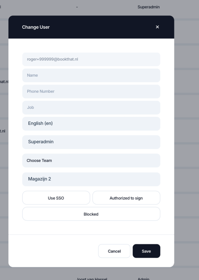 Je kan alle getoonde gegevens van een gebruiker wijzigen, behalve zijn of haar mailadres. Je kunt op deze manier een gebruiker bijvoorbeeld zelf een andere rol toebedelen of een team toewijzen. Klik op opslaan om de wijzigen vast te leggen.