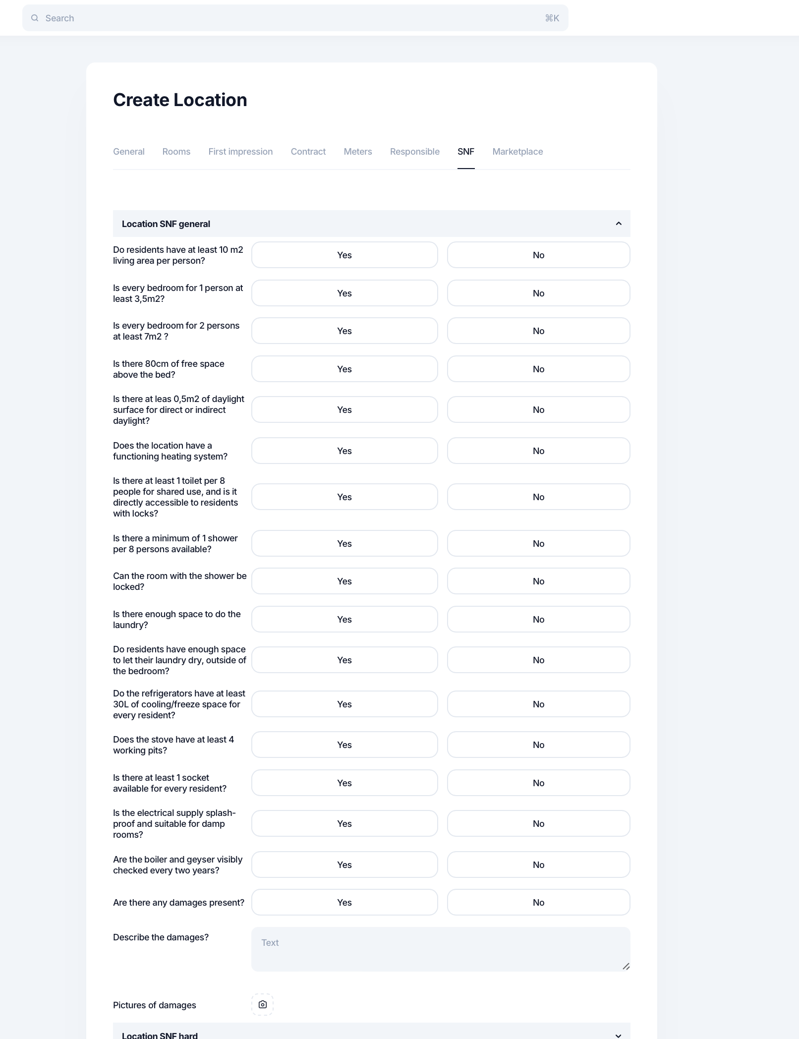 Het volgende tabblad in het locatie formulier is het tabblad SNF. In het tab SNF vind je alle SNF criteria terug, Je kan deze SNF criteria bij de aanhuur van een woning bijvoorbeeld eenmaal invullen, en zodra er iets wijzigt de criteria hier eventueel aanpassen. In de controle rapporten die je kan maken op woningen, kan je de meest veranderlijke zaken die invloed hebben op SNF ook nog los scoren. Hier gaat het om zaken zoals schimmel, lampen of bijvoorbeeld noodkaarten.