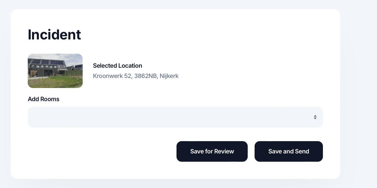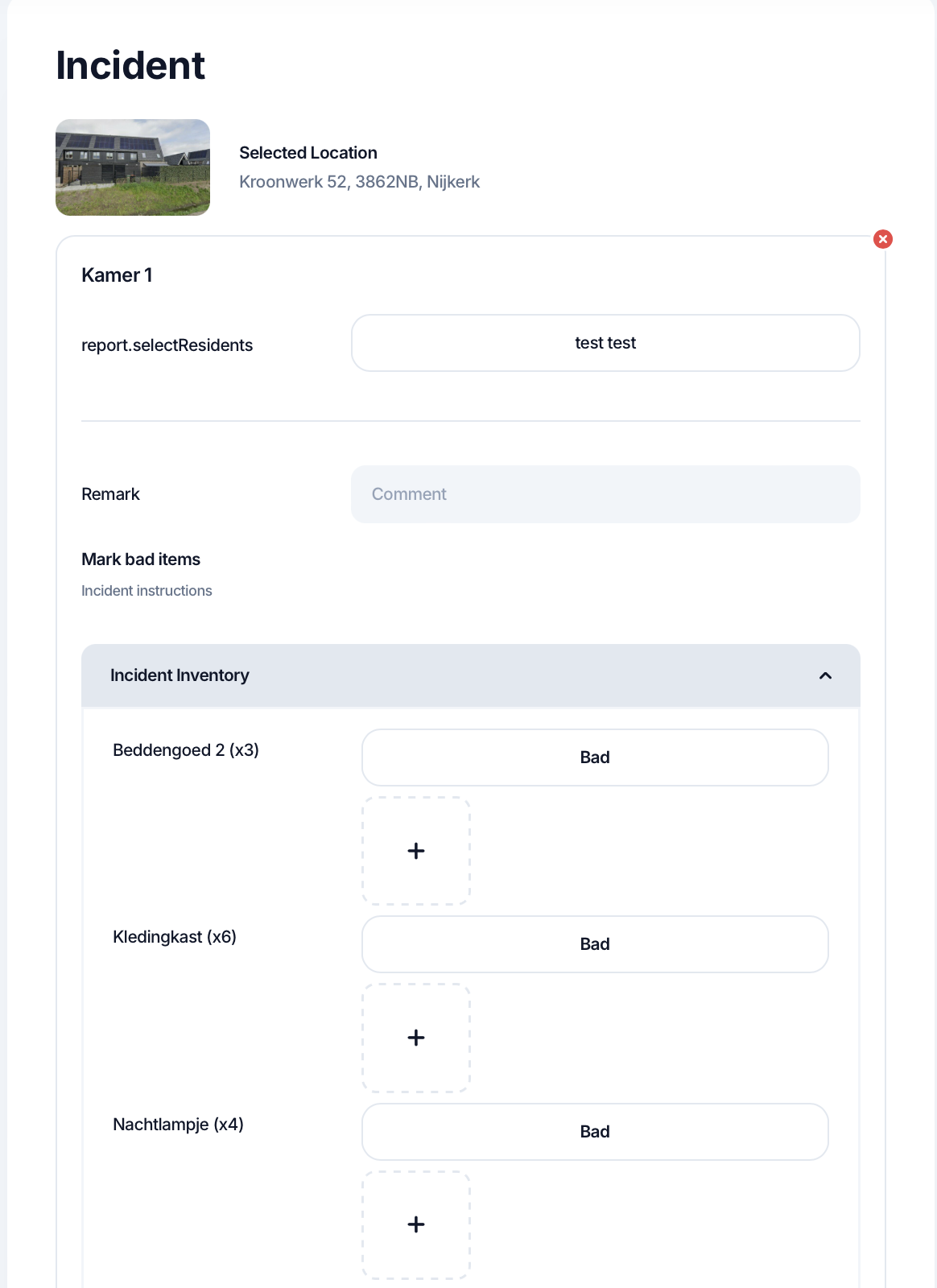 Het incident rapport bevat 1 pagina met daarop een selector waaruit je kan kiezen in welke kamer het incident heeft plaatsgevonden. Meerdere incidenten in verschillende kamers? Je kan alle kamers uit het huis gewoon toevoegen aan je rapport!